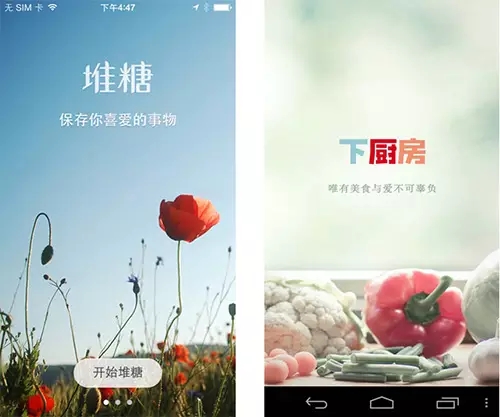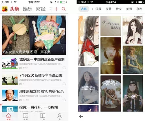 下面的左圖是一個新聞app,采用豎向分欄的布局,模塊化的結構使得信息的展現整潔和嚴謹。右圖是一個圖片展示app,則采用了三欄的布局,把圖片以這種瀑布流的形式展現給用戶,方便用戶快速瀏覽。但是由于平級的信息,很難區(qū)分主次,而人的視線很難在同一時間聚焦在兩個或者兩個以上的事物上,所以通過圖片錯路排列,使得畫面更為活潑。