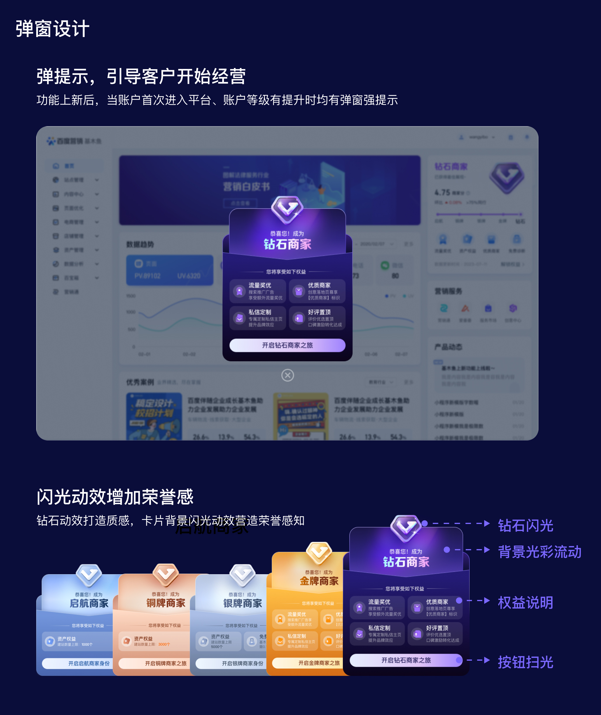 彈窗:作為常見(jiàn)的通知容器,常用于向用戶提供重要的通知、更新、提醒或行動(dòng)建議。在此項(xiàng)目中,為了增強(qiáng)商家的感知,我們選擇2個(gè)場(chǎng)景以彈窗的形式給予商家強(qiáng)提示,一是在功能上線后以彈窗的形式顯示對(duì)應(yīng)等級(jí)的信息,以吸引商家的注意力并傳達(dá)商家等級(jí)的關(guān)鍵信息,可以增加商家的感知并引導(dǎo)他們進(jìn)入商家等級(jí)開(kāi)始經(jīng)營(yíng);二是當(dāng)商家的等級(jí)提升時(shí)使用彈窗通知,激勵(lì)商家持續(xù)經(jīng)營(yíng)。