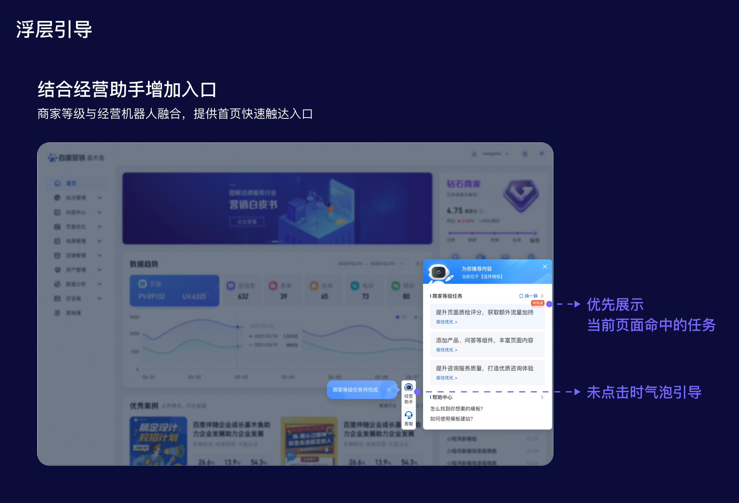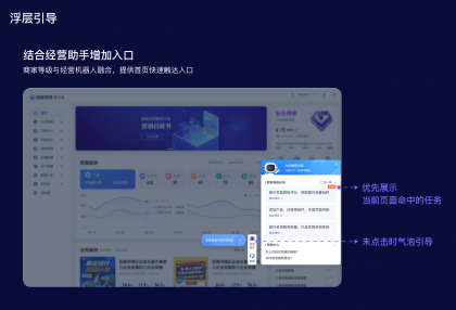 浮層:將操作入口前置披露,提升商家感知同時(shí)還可以縮短操作步長(zhǎng)。在商家等級(jí)項(xiàng)目里,衡量商家主動(dòng)經(jīng)營(yíng)的標(biāo)準(zhǔn)是做任務(wù),所以任務(wù)入口的前置披露是提升主動(dòng)經(jīng)營(yíng)的關(guān)鍵舉措。于是,圍繞商家等級(jí)包裝了“經(jīng)營(yíng)助手”的概念,幫助平臺(tái)給商家推薦一些成長(zhǎng)任務(wù)和優(yōu)化建議,并在平臺(tái)首頁(yè)主動(dòng)彈出,以此提高任務(wù)觸達(dá)率。但使用這種主動(dòng)觸達(dá)手段時(shí),需要考慮對(duì)商家的打擾和阻斷情況,所以需要對(duì)主動(dòng)彈出的頻率作限制,然后配合氣泡和標(biāo)簽等視效元素吸引商家視線。這樣可以引導(dǎo)商家參與商家等級(jí)完成任務(wù),促進(jìn)其成長(zhǎng)和等級(jí)提升。