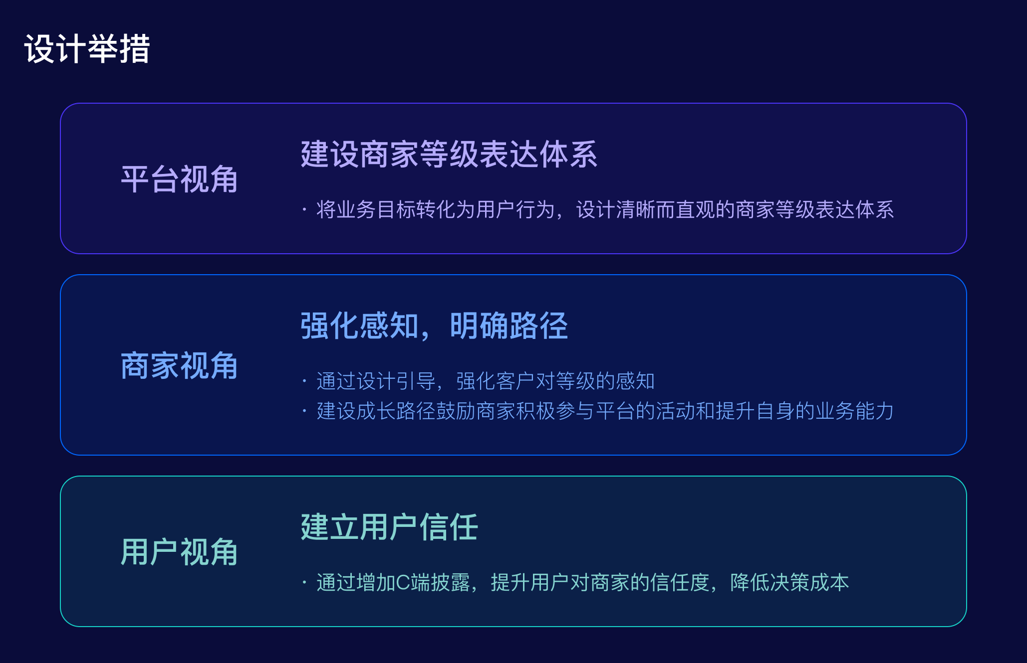 綜合以上分析,設(shè)計(jì)舉措應(yīng)注重建立商家等級(jí)表達(dá)、強(qiáng)化商家的感知和增強(qiáng)用戶的信任。希望通過(guò)設(shè)計(jì)目標(biāo)的實(shí)現(xiàn),為商家分層模型帶來(lái)更好的用戶體驗(yàn)和商業(yè)效益,提升商家的參與度和忠誠(chéng)度,促進(jìn)商業(yè)生態(tài)飛輪的正向運(yùn)轉(zhuǎn)。