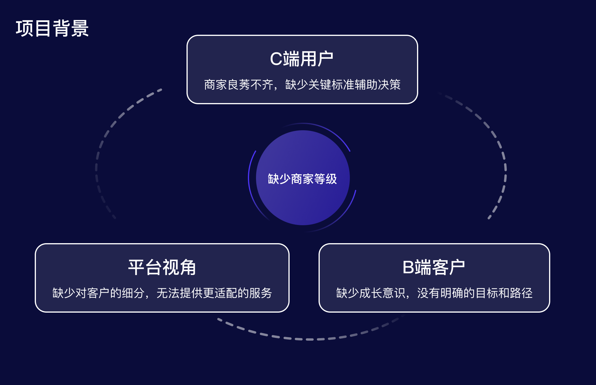 在設(shè)計(jì)之初,我們從不同的視角思考,對(duì)目標(biāo)進(jìn)行拆解和分析以獲得更全面、更多維的解決方案。從平臺(tái)視角分析,通過(guò)商家等級(jí)希望幫助商家快速定位服務(wù)短板,并提供有針對(duì)性的運(yùn)營(yíng)優(yōu)化策略,從而提高商家質(zhì)量和粘性;商家視角則希望通過(guò)商家等級(jí)獲得更多權(quán)益加持,從而提升轉(zhuǎn)化;C端用戶視角希望通過(guò)商家等級(jí),幫助降低決策成本,建立更多信任。
