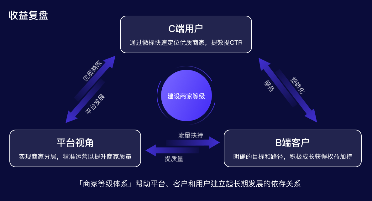 通過(guò)以上實(shí)施方案,設(shè)計(jì)師從不同視角切入,通過(guò)權(quán)益激勵(lì)吸引商家參與,通過(guò)明確用戶成長(zhǎng)路徑促進(jìn)等級(jí)提升和商家質(zhì)量的提升,為用戶提供更好的服務(wù),實(shí)現(xiàn)平臺(tái)生態(tài)的正向發(fā)展。