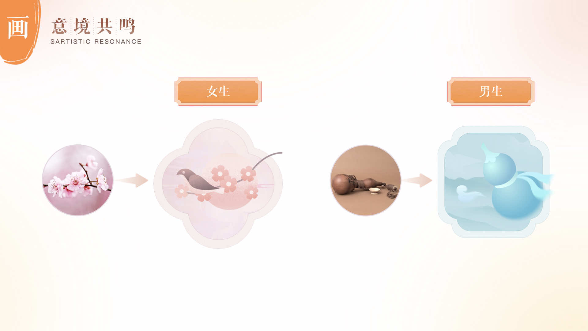 例如,女生的插畫圖形,首先劃分為偏向言情類型,由此聯(lián)想到一只小鳥站在桃花上,整體采用粉色調(diào)的場(chǎng)景進(jìn)行展現(xiàn),夢(mèng)幻而唯美。男生的插畫圖形則偏向玄幻類型,從而聯(lián)想到葫蘆,由此繪制出葫蘆和浮云結(jié)合的畫面,自由而飄逸。