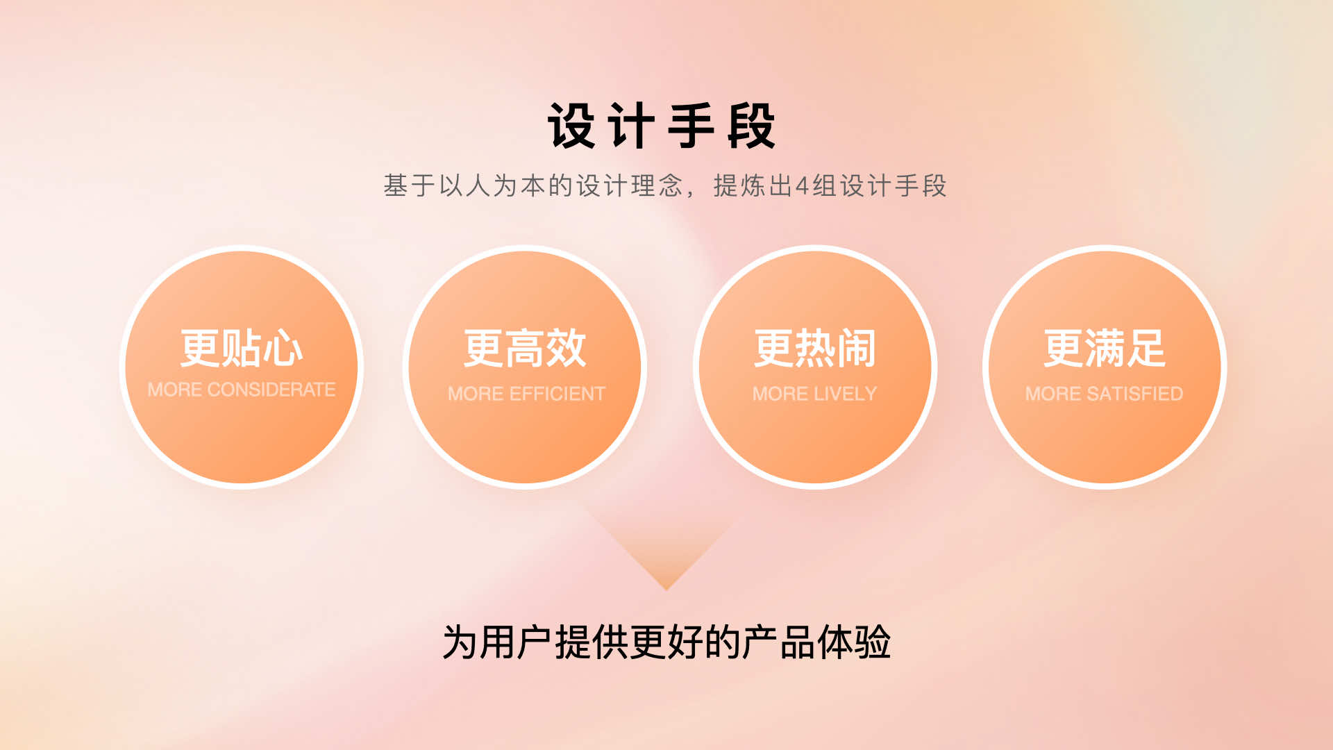 以人為本的設(shè)計(jì)理念不僅僅是視覺層面的展現(xiàn),還需要從用戶需求維度提供人性化的產(chǎn)品體驗(yàn),因此,我們提煉出了四組設(shè)計(jì)手段:更貼心、更高效、更熱鬧、更滿足。