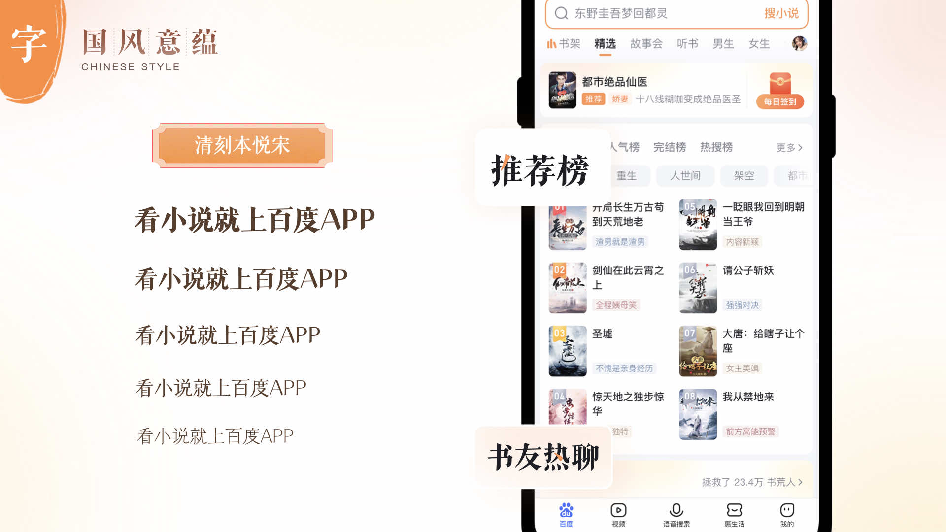 基于國風(fēng)意韻感,設(shè)計(jì)團(tuán)隊(duì)在文字的使用上,也選擇了一套襯線體字體,該字體字形瘦長,柔美清透且識(shí)別度高。在界面中,主要在標(biāo)題區(qū)應(yīng)用這套字體,將其中的一筆進(jìn)行跳色點(diǎn)綴,不僅讓用戶閱讀舒適,而且提升百度小說的品牌識(shí)別度。