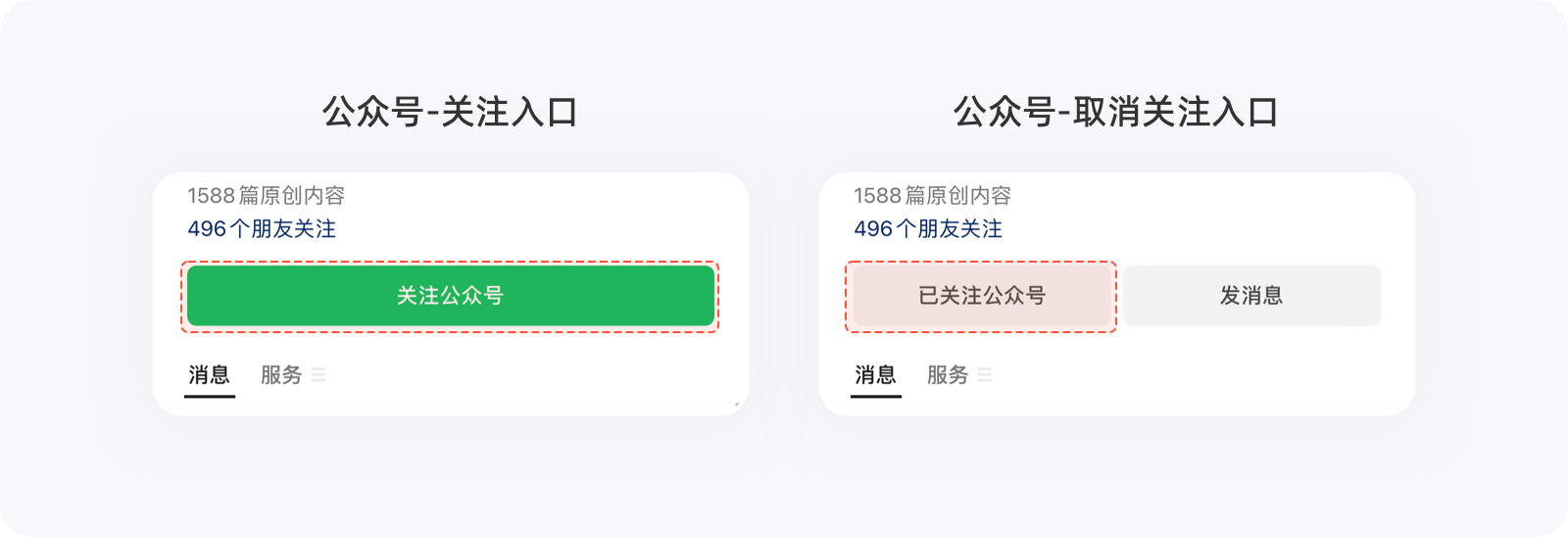 有時(shí)候,出于商業(yè)化的目的,同一個(gè)選項(xiàng)在二次操作時(shí),產(chǎn)品會(huì)刻意增加用戶操作成本,以降低選擇效率,看似希克定律的反向操作,卻一定程度地降低了用戶退出率,實(shí)則對(duì)產(chǎn)品有益。例如,在關(guān)注微信公眾號(hào)之前,非常醒目的關(guān)注按鈕觸手可及,可關(guān)注之后,弱化的幽靈按鈕及文案,很難一眼看出這就是取消關(guān)注入口,需要用戶花費(fèi)額外的時(shí)間去理解或試錯(cuò)方可取關(guān),這么做能降低公眾號(hào)粉絲的取關(guān)量。為公眾號(hào)留住粉絲,更是對(duì)內(nèi)容認(rèn)可的一種支持,后面的良性循環(huán)無(wú)需多講。