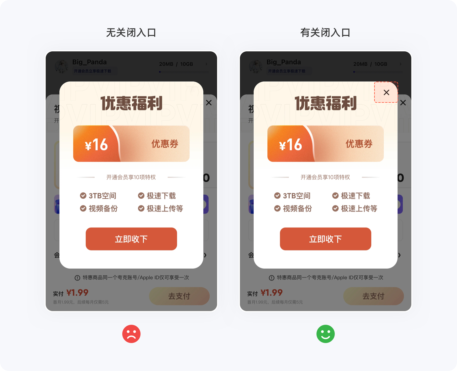 ??硕梢龅氖峭ㄟ^(guò)減少用戶做決定的時(shí)間,來(lái)提升轉(zhuǎn)化率以及用戶體驗(yàn),但不管在什么情況下,用戶都希望自己還擁有選擇的權(quán)利,如果設(shè)計(jì)師自作聰明的將選項(xiàng)減到只剩一個(gè),就相當(dāng)于告知用戶必須接受,那么用戶就有種被強(qiáng)制、綁架的感覺(jué),只會(huì)存在兩個(gè)結(jié)果:①被你的產(chǎn)品拿捏、②離開(kāi)你的產(chǎn)品,筆者相信第一種可能性的概率極低,畢竟同類(lèi)型的產(chǎn)品并不是只有你一家(壟斷除外)。如下圖的彈窗,用戶即便不愿意進(jìn)入任務(wù)流程,可別無(wú)選擇,只能進(jìn)入后再返回才能回到原位,這種做法無(wú)端增加用戶的操作成本,極易引起反感情緒。不管產(chǎn)品如何希望用戶轉(zhuǎn)化,切不可強(qiáng)制他們接受,需要給用戶留一條返回的“路”,即便不那么起眼,至少還有選擇的權(quán)利。