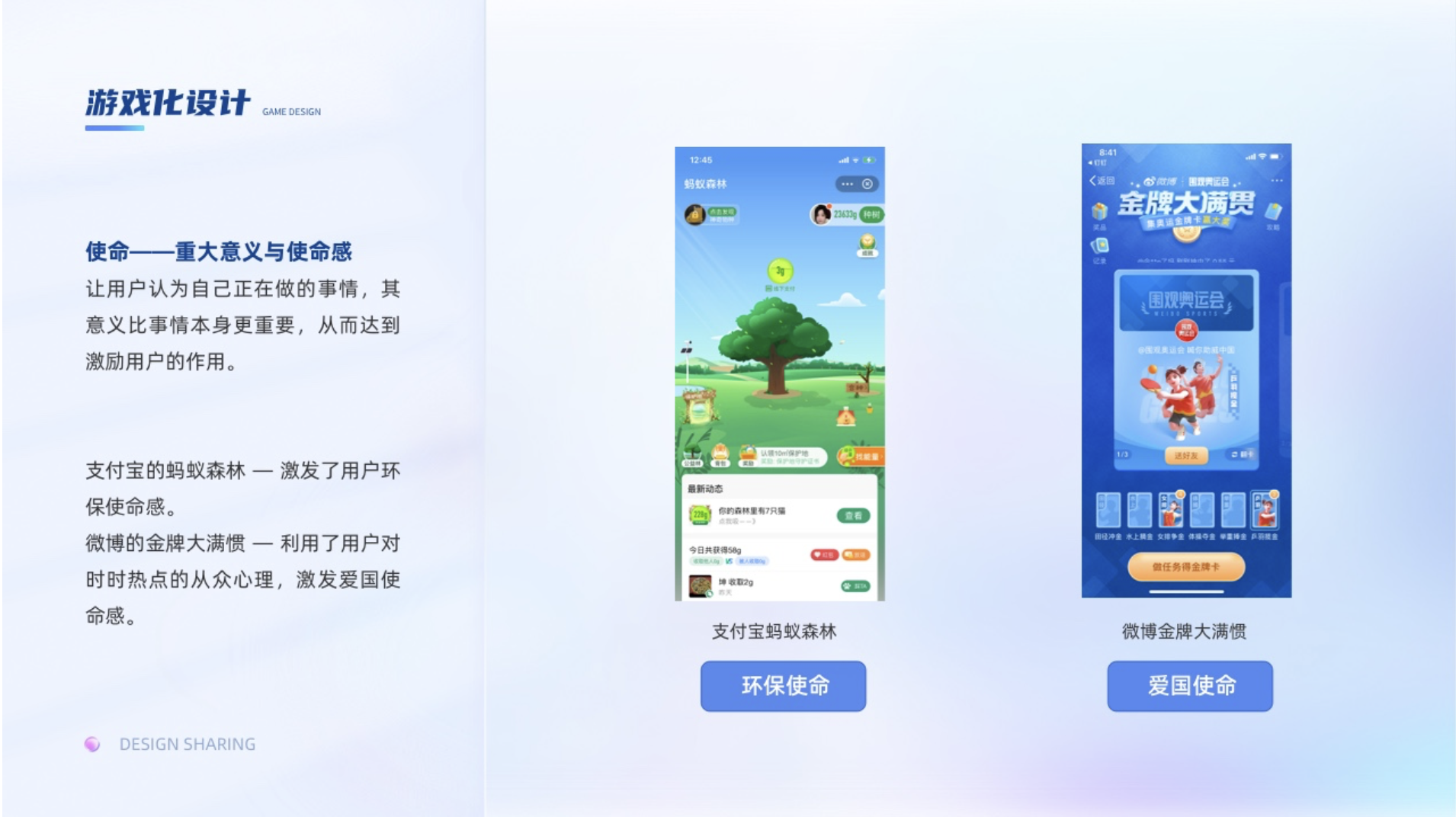 讓用戶認(rèn)為自己正在做的事情,其意義比事情本身更重要,從而達(dá)到激勵(lì)用戶的作用。譬如支付寶里面的螞蟻森林,種的不是樹,而是地球的一點(diǎn)綠,這個(gè)使命感瞬間油然而生,在玩的過程中還能幫助地球綠化,激發(fā)了用戶環(huán)保使命感。再比如在奧運(yùn)期間的微博的金牌大滿慣的活動(dòng),以圍觀奧運(yùn)會(huì)之名,集奧運(yùn)金牌卡喊你助威中國(guó),利用了用戶對(duì)時(shí)時(shí)熱點(diǎn)的從眾心理,又聯(lián)系到了愛國(guó)上升了到了愛國(guó)使命感。