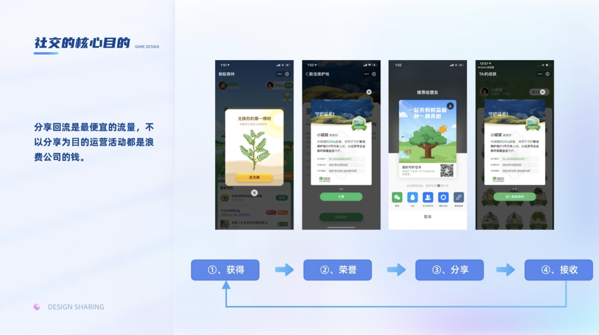 指參與過程中取得進(jìn)步、獲得技能、獲得榮譽(yù),從而獲得成就感,去克服困難達(dá)成目標(biāo)。一般我們會(huì)通過證書,勛章,排行榜等去給與用戶成就獎(jiǎng)勵(lì)。挑戰(zhàn)和技能是促使用戶不斷升級(jí)的主要因素,為了讓用戶沉浸其中護(hù)住心流,適當(dāng)?shù)奶魬?zhàn)難度和技能解鎖就顯得尤為重要。挑戰(zhàn)難度高了容易引起用戶的焦慮,難度低了又會(huì)讓用戶感覺無聊。比如集卡行動(dòng),在考慮總預(yù)算不變的情況下,如何設(shè)置稀有卡的比例,集卡的難度就尤為重要。支付寶集五福在初期,敬業(yè)福的比例比較低,所以用戶抽到敬業(yè)福的體驗(yàn)就很開心,但隨著支付寶后面為了擴(kuò)大社交屬性,提高了集齊率,集五到五福的興奮感就弱了,導(dǎo)致部分用戶失去動(dòng)力,因?yàn)榧降娜嗽蕉嗪罄m(xù)瓜分的錢就越少。