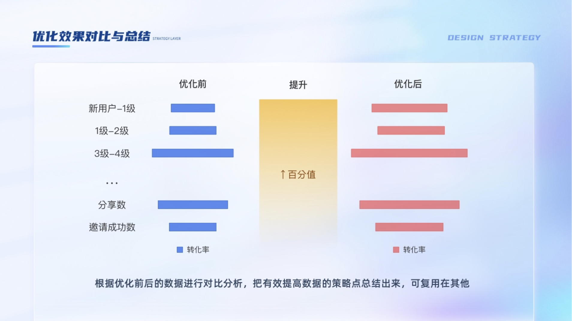 根據(jù)優(yōu)化前后的數(shù)據(jù)進(jìn)行對(duì)比分析,把有效提高數(shù)據(jù)的策略點(diǎn)總結(jié)出來,可復(fù)用在其他項(xiàng)目。