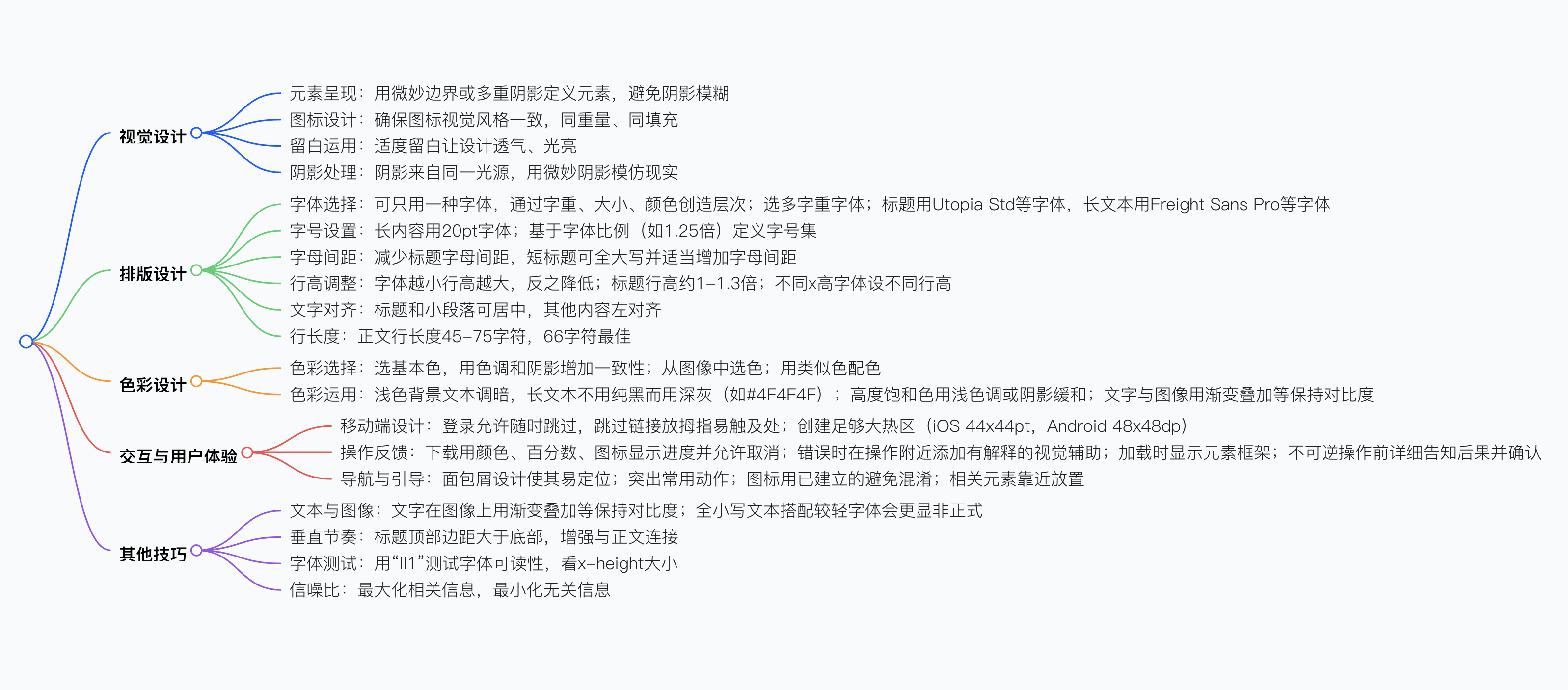 收集了 多個(gè) UI 和 UX 設(shè)計(jì)小技巧,涵蓋視覺(jué)設(shè)計(jì)、排版、色彩、交互等多方面,包括通過(guò)微妙邊界或多重陰影讓元素更清晰、減少標(biāo)題字母間距以實(shí)現(xiàn)視覺(jué)平衡、確保圖標(biāo)風(fēng)格一致、適當(dāng)留白使設(shè)計(jì)更透氣、20pt 字體提升長(zhǎng)文本閱讀體驗(yàn)、基于字體比例定義字號(hào)集、選擇基本色并通過(guò)色調(diào)和陰影增加一致性、移動(dòng)端登錄允許用戶隨時(shí)跳過(guò)并將跳過(guò)鏈接放在拇指易觸及位置、確保陰影來(lái)自同一光源、合理進(jìn)行圖層管理、通過(guò)色彩對(duì)比度等突出重要元素、錯(cuò)誤時(shí)添加視覺(jué)輔助、移動(dòng)端創(chuàng)建足夠大熱區(qū)、保持文字與圖像對(duì)比度等,這些技巧能通過(guò)最小調(diào)整改善設(shè)計(jì)細(xì)節(jié)和用戶體驗(yàn)。