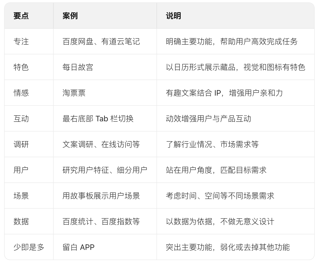 - 答案:設(shè)計(jì)前的案例分析包含專注(明確主要功能)、特色(區(qū)別于同行的功能、體驗(yàn)或視覺(jué))、情感(加入情感化設(shè)計(jì))、互動(dòng)(運(yùn)用動(dòng)效)、調(diào)研(了解行業(yè)和市場(chǎng))、用戶(研究用戶特征和需求)、場(chǎng)景(考慮用戶使用場(chǎng)景)、數(shù)據(jù)(以數(shù)據(jù)為設(shè)計(jì)依據(jù))、少即是多(突出主要功能)這 9 個(gè)關(guān)鍵要點(diǎn)。
