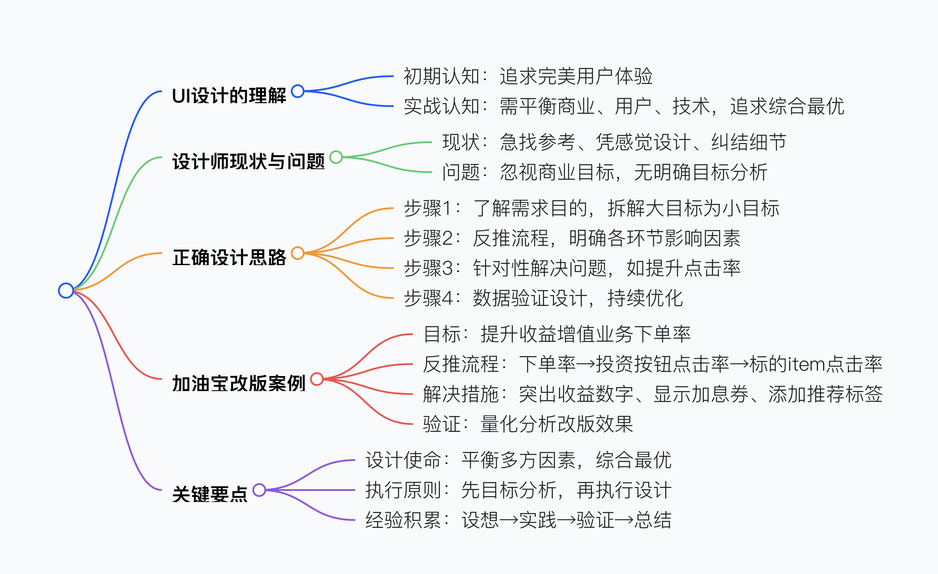 UI 設(shè)計(jì)的終極目標(biāo)并非單純追求極致用戶體驗(yàn),而是在「商業(yè)」「用戶」「技術(shù)」等多方面條件限制下取得平衡,得出「綜合最優(yōu)」的解決方案。設(shè)計(jì)師常陷入拿到需求就找參考、憑感覺設(shè)計(jì)、在細(xì)節(jié)糾結(jié)的誤區(qū),正確做法是先明確需求背后的商業(yè)目標(biāo),將大目標(biāo)拆解為小目標(biāo),如加油寶 APP6.0 改版時(shí)為提升 “收益增值業(yè)務(wù)下單率”,反推需提升標(biāo)的 item 點(diǎn)擊率、“立即投資” 按鈕點(diǎn)擊率等,再針對性解決,最后通過數(shù)據(jù)驗(yàn)證設(shè)計(jì)效果,如此才能積累經(jīng)驗(yàn)、理清思路。