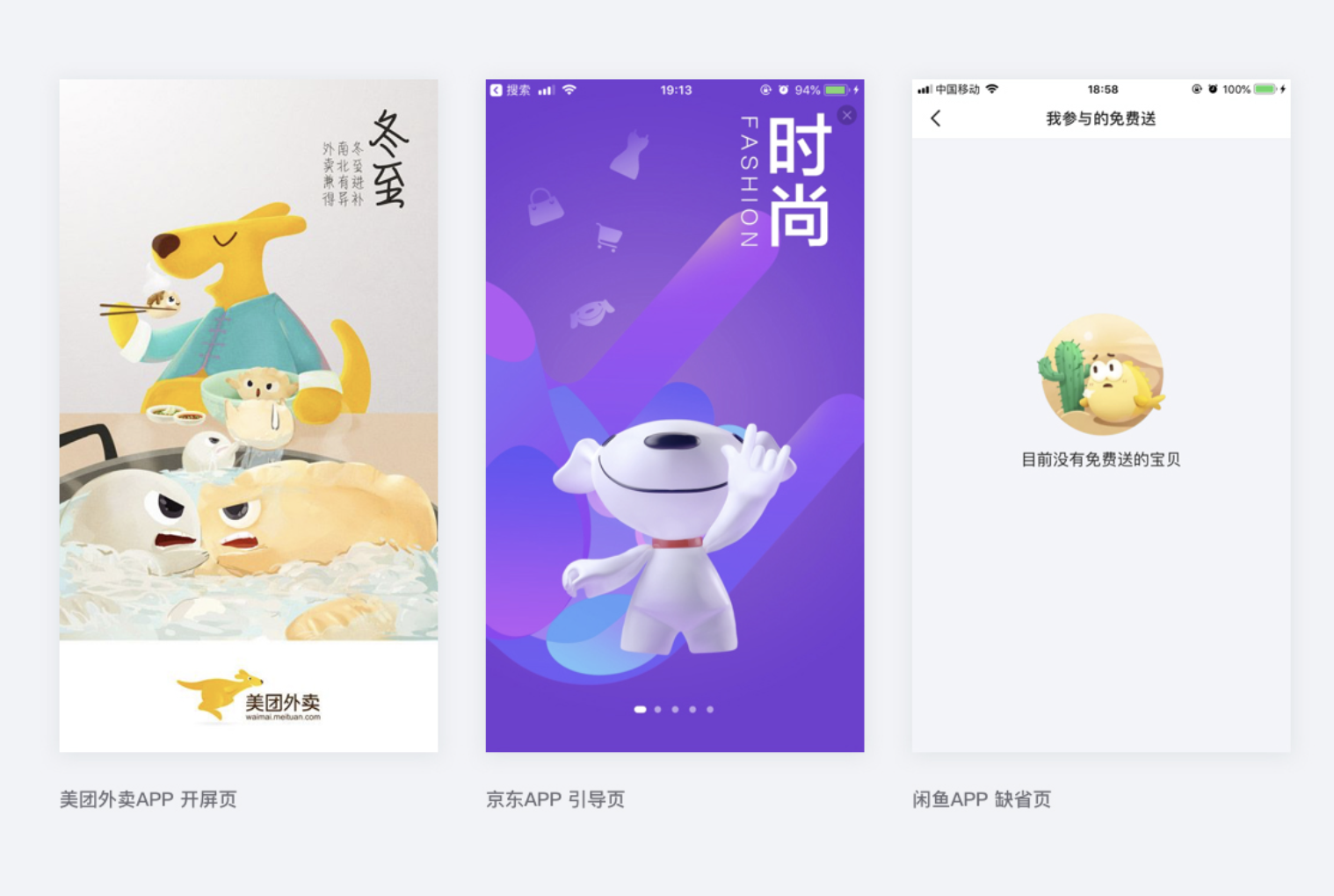 - 獨特的 IP 形象設計:識別度高的 IP 形象帶給用戶親切感,拉近用戶與產品、企業(yè)的關系,打造品牌效應并延展融入日常生活,如美團外賣 APP 開屏頁、京東 APP 引導頁、閑魚 APP 缺省頁等展示企業(yè) IP 形象。