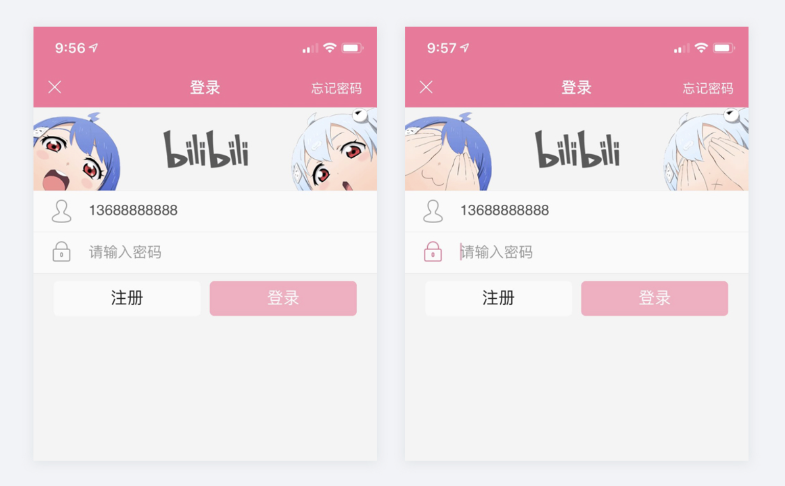 - 有趣的擬人化動作設計:產品作出擬人化互動反饋,讓用戶感到有趣,如嗶哩嗶哩 APP 登錄輸入密碼時,IP 形象 22 和 33 會把眼睛捂起來,給用戶安全感且有趣。