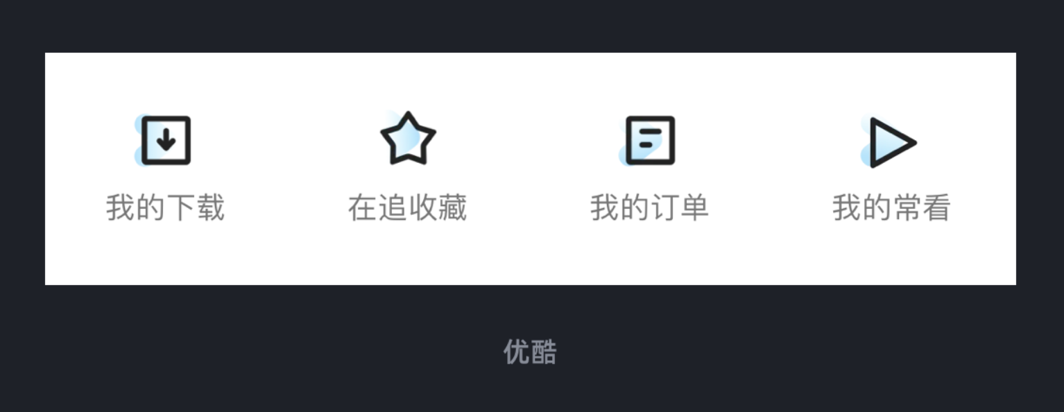 比如優(yōu)酷個(gè)人中心的圖標(biāo) ——“我的下載”“我的訂單” 這些功能按鈕,都采用簡潔的線性風(fēng)格,但在圖標(biāo)的底層悄悄疊加了優(yōu)酷的品牌圖形元素。這種 “線性 + 品牌點(diǎn)綴” 的設(shè)計(jì),既保持了界面的清爽感,又讓圖標(biāo)跳出了 “千篇一律” 的困境,用戶看到圖標(biāo)時(shí),會(huì)下意識(shí)聯(lián)想到 “這是優(yōu)酷的設(shè)計(jì)”,慢慢形成記憶點(diǎn)。