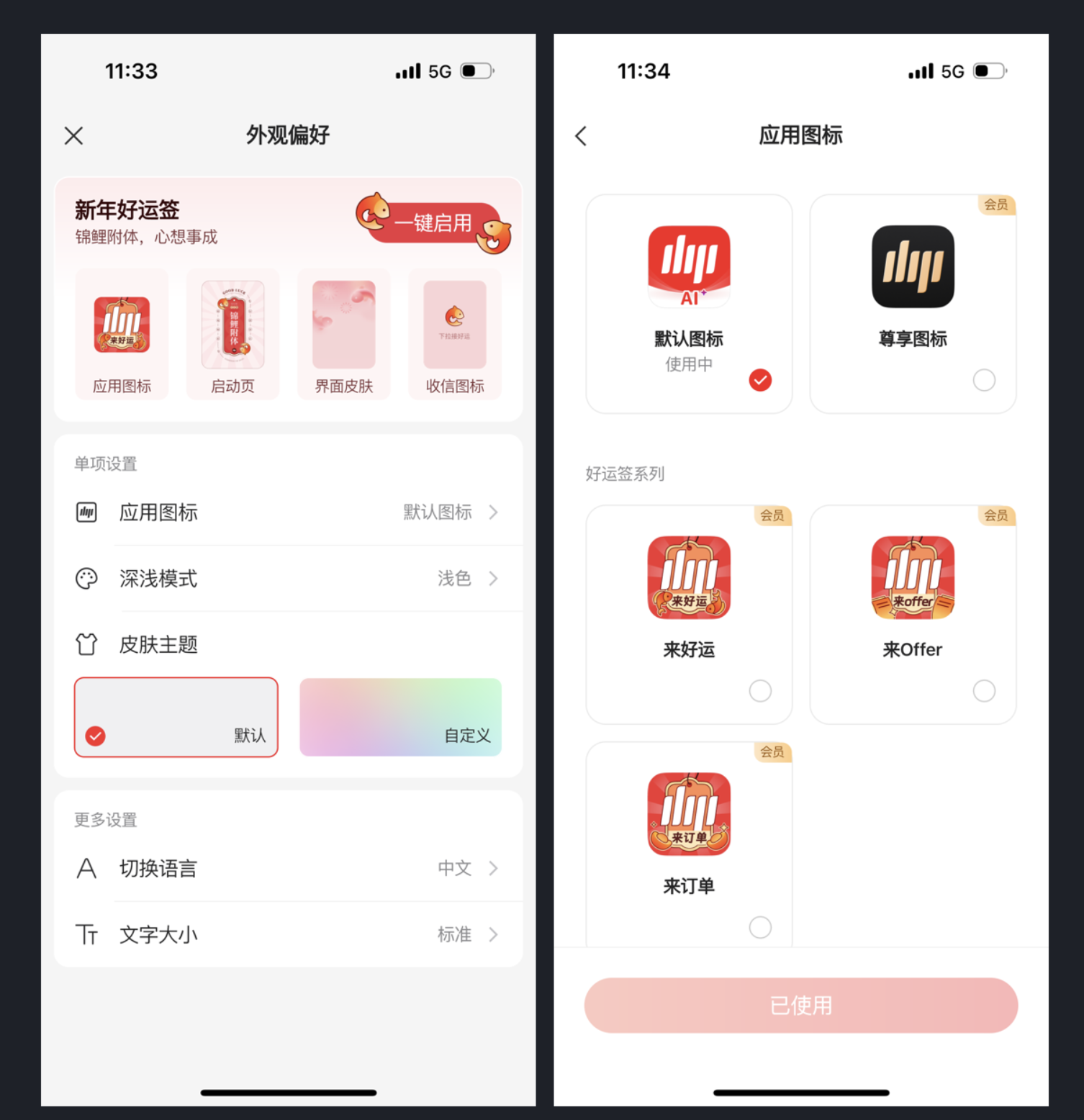 更貼心的是,這些設(shè)置都支持 “單項(xiàng)調(diào)整”—— 比如用戶只想換圖標(biāo),不用連帶改皮膚;想調(diào)文字大小,也不用重新設(shè)置模式。這種 “精細(xì)化自定義”,讓用戶感覺 “這個(gè) APP 是為我量身定制的”,不僅降低了審美抵觸,還悄悄提升了用戶對(duì)產(chǎn)品的好感度。