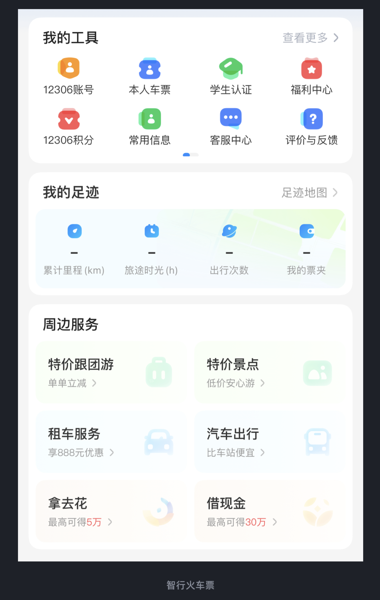 在智行火車票的個(gè)人中心里,有 “我的工具”“常用信息”“周邊服務(wù)” 三個(gè)主要版塊。其中 “我的工具”(12306 賬號(hào)、本人車票、學(xué)生認(rèn)證等)和 “常用信息”(我的足跡、我的票夾等)是用戶高頻使用的功能,所以這兩個(gè)版塊的圖標(biāo)用了 “高飽和度、低明度” 的配色,視覺張力強(qiáng),能第一時(shí)間吸引用戶的注意力;而 “周邊服務(wù)”(特價(jià)跟團(tuán)游、租車服務(wù)、拿去花等)是輔助功能,圖標(biāo)就采用了 “高明度、低飽和度” 的處理方式,顏色更淺、更柔和,視覺上故意 “弱化”。