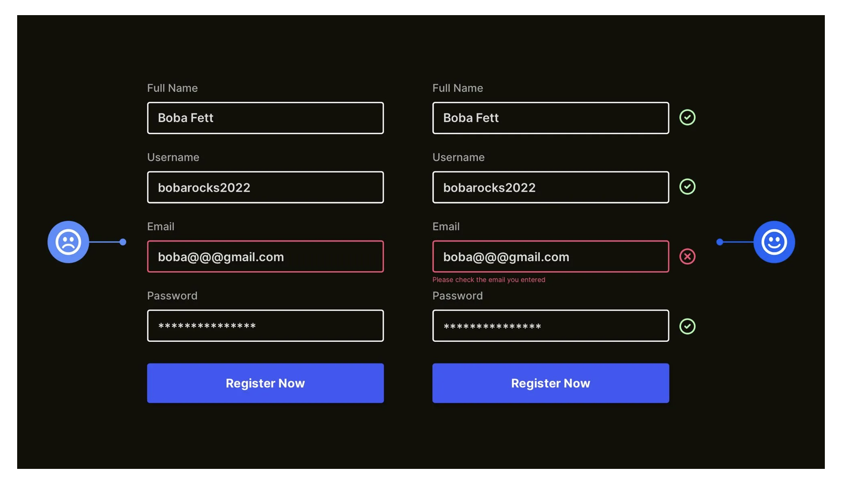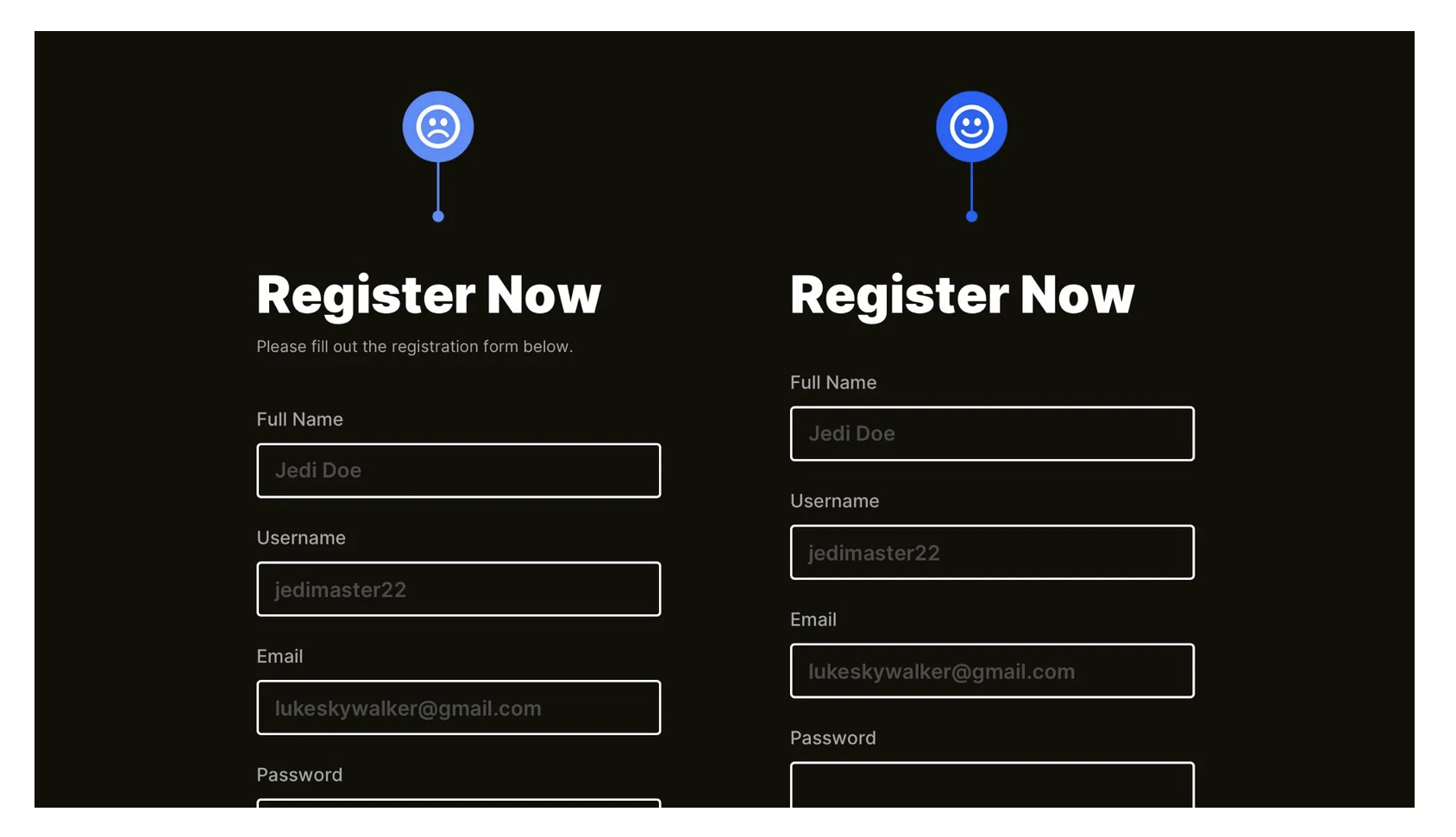 只需添加 “即時反饋” 功能:用戶輸入完一個字段后,立即用簡單圖標(biāo) + 短句提示結(jié)果 —— 比如輸入正確的郵箱時,顯示 “√ 郵箱格式正確”;輸入錯誤時,顯示 “× 請檢查郵箱格式(需包含 @和后綴)”。無需復(fù)雜動效,簡單的反饋就能提升表單填寫體驗,減少提交失敗的流失。