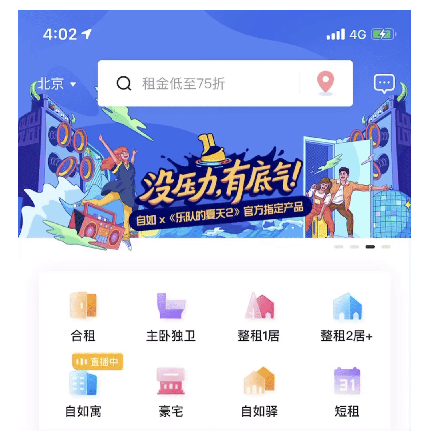 通欄 Banner 是首屏的 “???rdquo;—— 它占據(jù)整個(gè)頁(yè)面寬度,視覺沖擊力強(qiáng),適合傳遞單一、重要的信息,比如產(chǎn)品的年度活動(dòng)、核心功能更新。以自如的首頁(yè) Banner 為例,通欄設(shè)計(jì)搭配 “租金低至 75 折” 的大標(biāo)題,配合分層視覺效果,瞬間抓住用戶對(duì) “優(yōu)惠” 的注意力;再如工具類 APP 的 “版本更新” Banner,通欄布局讓 “立即升級(jí)” 的入口更突出,降低用戶操作成本。