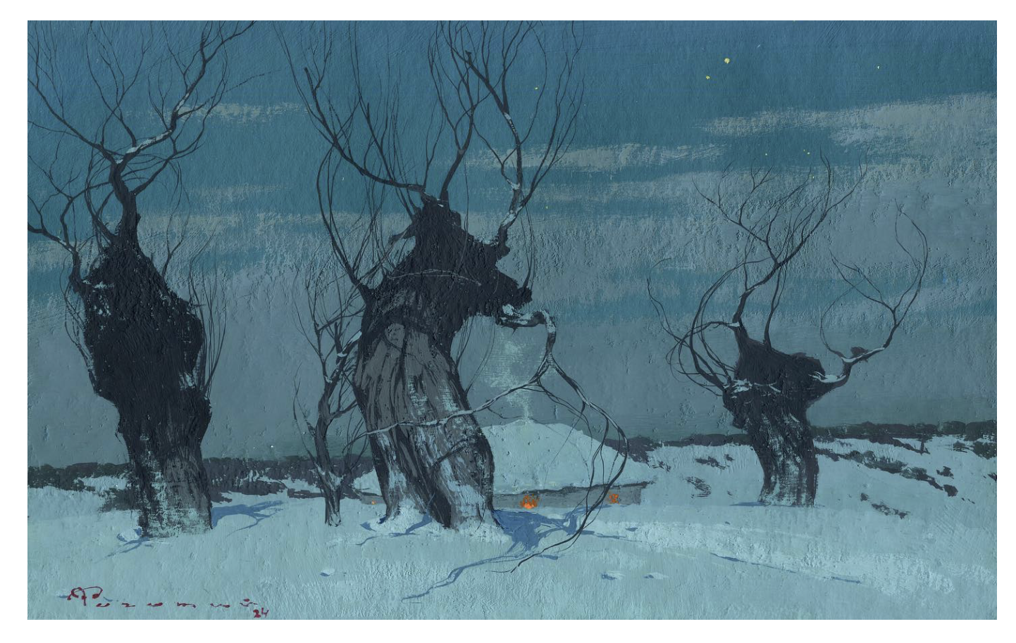 Artem Rohovyi 的創(chuàng)作核心,是對冬日枯樹的深度描摹。在他筆下,枯樹不再是生命凋零的象征,而是冬日浪漫的 “骨架”。