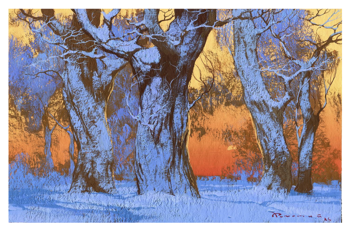 - 配色的矛盾與和諧:藍紫色的冷、晚霞的暖、枯樹的褐,這些看似沖突的色彩在他的畫布上完美融合。這種 “怪異卻合理” 的配色邏輯,讓每一幅作品都自帶辨識度,既保留了冬日的清冷基調(diào),又注入了浪漫的溫度。