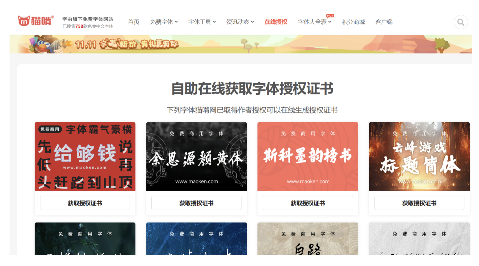 專注于中文字體的貓啃網(wǎng),是個(gè)人設(shè)計(jì)師和小型工作室的福音。平臺(tái)已搜集 758 款免費(fèi)商用中文字體,更新頻率高,經(jīng)常能挖到新發(fā)布的優(yōu)質(zhì)字體,冷門小眾款也能在這里找到。