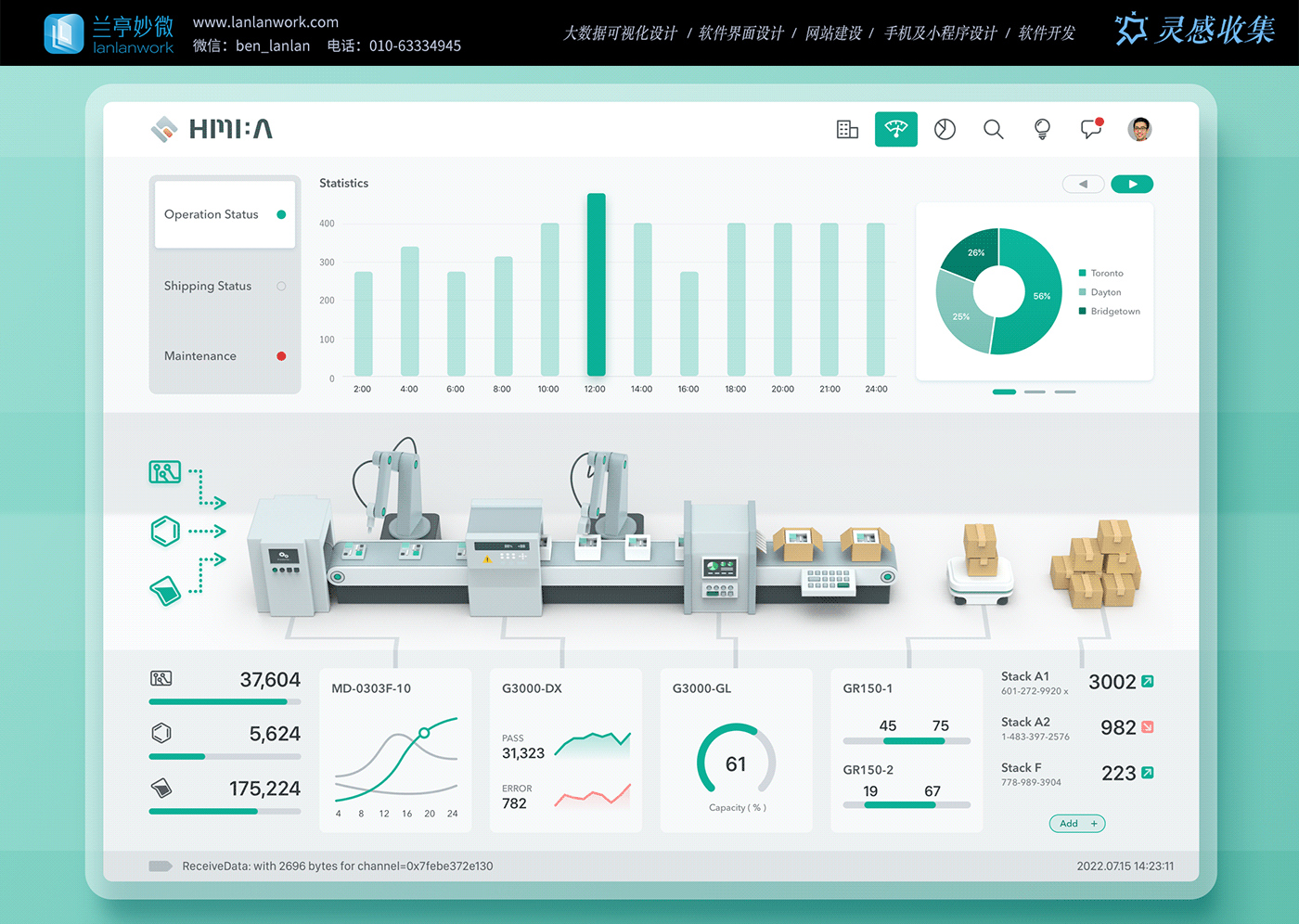 底層操作層則將關鍵指標(如 “37,604”“5,624”)與設備狀態(tài)(如 G3000-DX 的 PASS/ERROR 曲線)模塊化封裝,每個卡片都是一個 “信息孤島”,但通過統(tǒng)一的視覺規(guī)范(圖標 + 數(shù)值 + 狀態(tài)圖)形成協(xié)同,既滿足了 “分模塊監(jiān)控” 的需求,又避免了界面混亂。