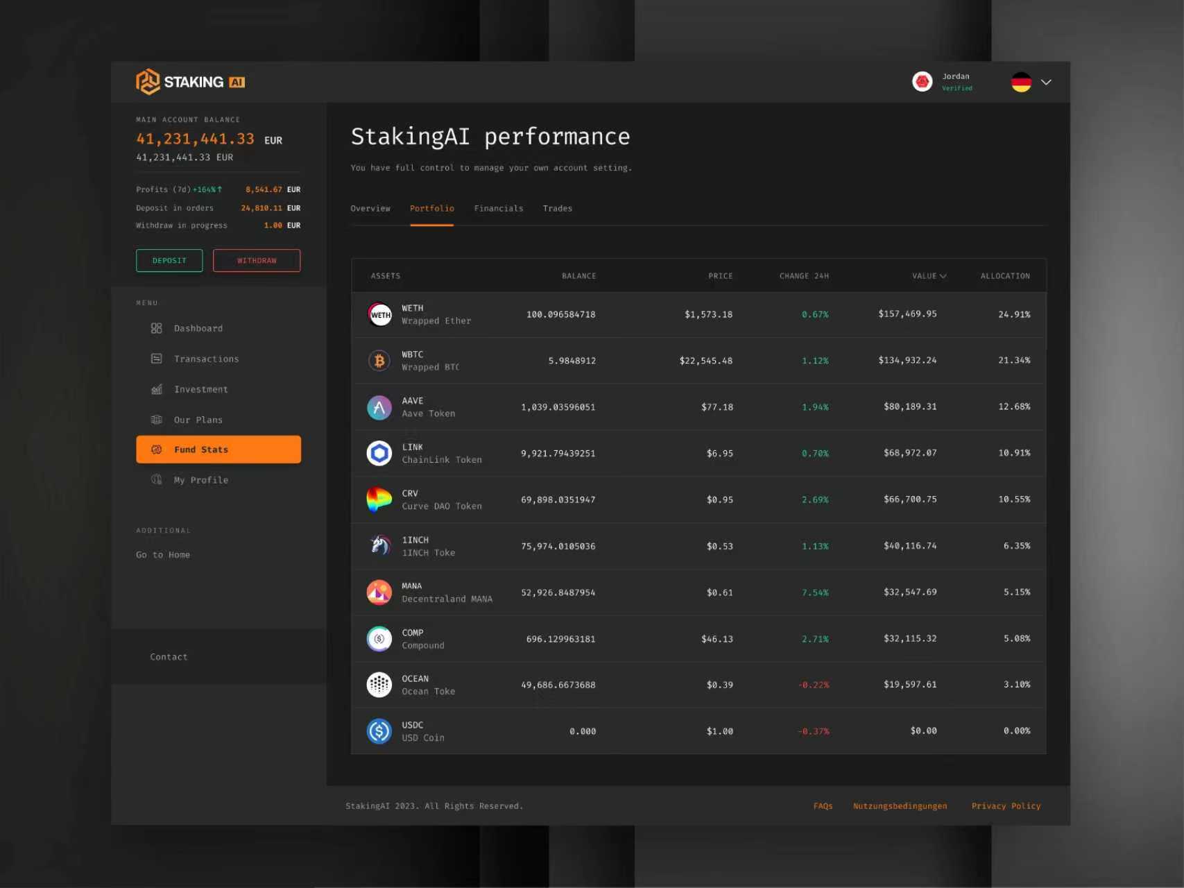 操作入口前置:左側(cè)的 “DEPOSIT/WITHDRAW” 按鈕、頂部的 “Portfolio/Financials/Trades” 標(biāo)簽,將 “充提幣、資產(chǎn)配置、交易記錄” 等高頻操作前置,操作路徑縮短至 1 步,契合加密市場(chǎng) “時(shí)效性優(yōu)先” 的交易特點(diǎn)。