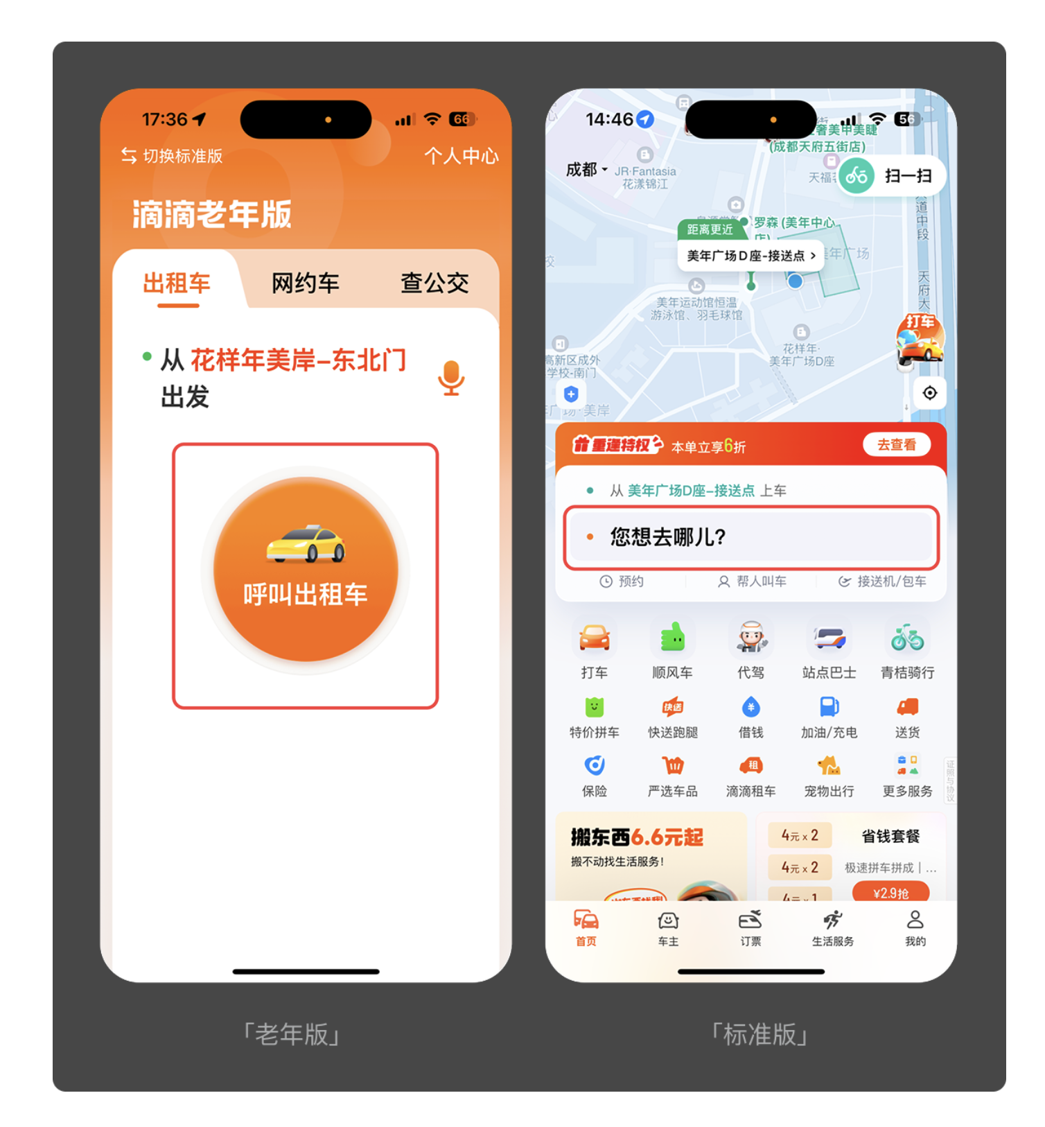對(duì)老年人而言,多余的操作步驟就是無(wú)形的門檻。優(yōu)秀的適老化設(shè)計(jì)會(huì)砍掉非必要功能,讓核心需求一鍵直達(dá)。滴滴老年版便是典型案例:標(biāo)準(zhǔn)版需要先輸入目的地再點(diǎn)擊叫車,而老年版直接在首頁(yè)設(shè)置 “呼叫出租車” 大按鈕,省去輸入環(huán)節(jié),讓用戶無(wú)需學(xué)習(xí)就能完成叫車。QQ 老年版同樣簡(jiǎn)化了動(dòng)態(tài)查看流程,標(biāo)準(zhǔn)版需兩次點(diǎn)擊才能進(jìn)入的頁(yè)面,老年版一次點(diǎn)擊即可直達(dá),大幅提升操作效率。