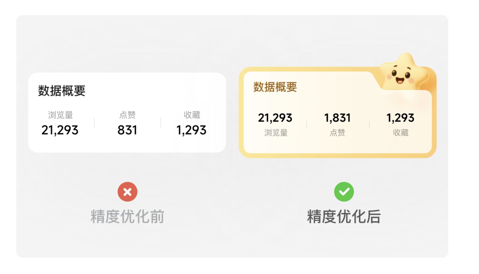 數(shù)據(jù)卡片的核心是傳遞數(shù)字信息,優(yōu)化需兼顧 “可讀性” 與 “視覺吸引力”,避免陷入 “純文字堆砌” 的誤區(qū)。