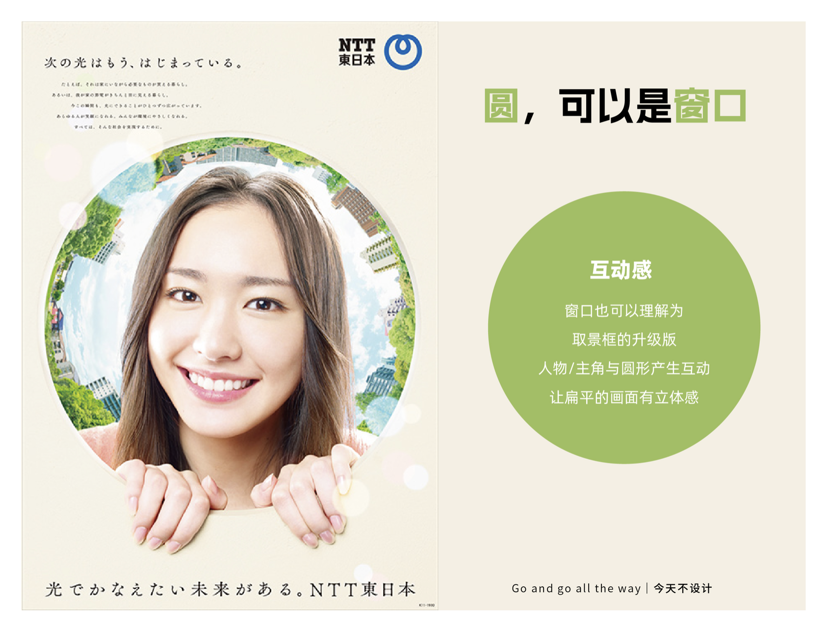 窗口式圓形可通過(guò)互動(dòng)營(yíng)造立體氛圍。NTT 東日本的品牌海報(bào)中,設(shè)計(jì)師將圓形化作 “光的窗口”,畫(huà)面中的人物似乎正透過(guò)窗口望向未來(lái),光線(xiàn)從圓形中溢出,與背景的深色形成對(duì)比,既傳遞了 “未來(lái)可期” 的品牌理念,又讓扁平的畫(huà)面產(chǎn)生了前后景深,立體感十足。這種互動(dòng)感打破了海報(bào)的二維局限,讓觀(guān)者感受到 “窗口內(nèi)外” 的空間差異,情緒上更易產(chǎn)生共鳴。