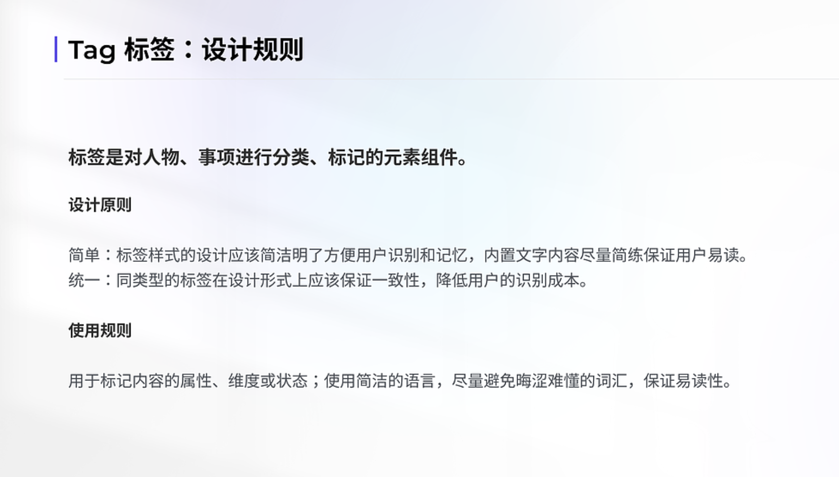 規(guī)范的最終目的是落地應(yīng)用,需根據(jù)不同產(chǎn)品場(chǎng)景明確標(biāo)簽的使用規(guī)則,讓設(shè)計(jì)師快速判斷適配類型。