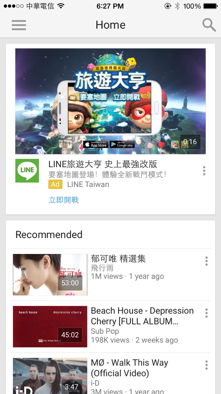 例如 YouTube 應(yīng)用一點(diǎn)開,你就知道這個(gè)應(yīng)用的基礎(chǔ)內(nèi)容是什麼了。下面有推薦的內(nèi)容,第一欄的 Home bar 則有明顯的查詢標(biāo)識(shí),讓用戶可以馬上開始查他想看的影片。