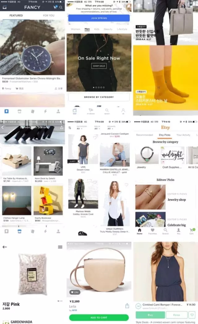接下來我們就需要對這些 apps 進行視覺風格上的拆分,來看看到底是哪些視覺表現(xiàn)讓大家覺得它們是時尚、簡潔的。我們可以依據(jù)經(jīng)驗對視覺表現(xiàn)劃分幾個維度(比如以下幾個),接下來我將以購物應用為例,從以上幾個維度來示意分析的方法。