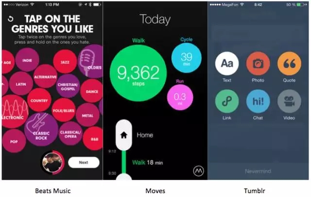 Beats Music把選擇喜歡的標簽設計成了圓形,這就比普通的列表、矩形tag的感覺要好很多,更加趣味更具探索性。Movse每天走的步數(shù)、消耗的卡路里均用圓形承載,是數(shù)據(jù)可視化、關(guān)鍵信息顯性化的最好案例。Tumblr則把要創(chuàng)建的內(nèi)容的類型選擇,用蒙層+圓形選項按鈕來設計,讓選擇變得專注而明確,又不那么死板。