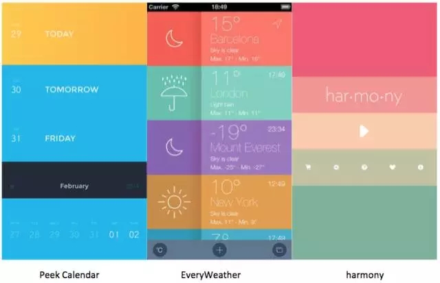 而Peek Calendar、EveryWeather和Harmony這三個APP,是列表多彩色的設計案例,這種列表多彩色,不知道是不是從Clear開始再度流行起立的,用鮮亮的多彩色來區(qū)分信息,確實能起到突出的效果,視覺上極其醒目。