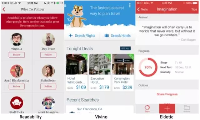 Readability采用紅色主色調(diào)設計,連提示信息背景色、線性按鈕和圖標都采用紅色主色調(diào),界面和LOGO也完全是一個色系的。而Vivino采用藍色主色調(diào)設計,信息用深藍、淺藍加以區(qū)隔。Eidetic采用橙色主色調(diào)設計,其中的關(guān)鍵操作按鈕甚至整個用橙色提亮,信息圖標也用深橙色、淺橙色來表達程度。 可以說唯一主色調(diào)設計手法,是真的做到了移動端APP的最小化(Minimal)設計,減少冗余信息的干擾,使用戶專注于主要信息的獲取。