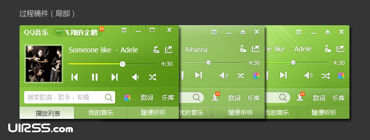 早在2011年7月,QQ音樂2011beta版的發(fā)布便確立了用品牌色–綠色,做為QQ音樂客戶端的默認(rèn)顏色,綠色代表和平、希望、生長(zhǎng)和環(huán)保,對(duì)QQ音樂的品牌形象有積極的正面意義,此外,縱觀競(jìng)品,常見的客戶端配色多為黑和藍(lán),用綠色也較利于提高產(chǎn)品的識(shí)別度。QQ音樂2012賀歲版的視覺,也是圍繞綠色和細(xì)節(jié)進(jìn)行全面的體驗(yàn)優(yōu)化。項(xiàng)目從去年12月31號(hào)開始,進(jìn)行了為期15天的設(shè)計(jì)和快速迭代。