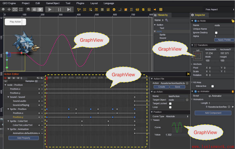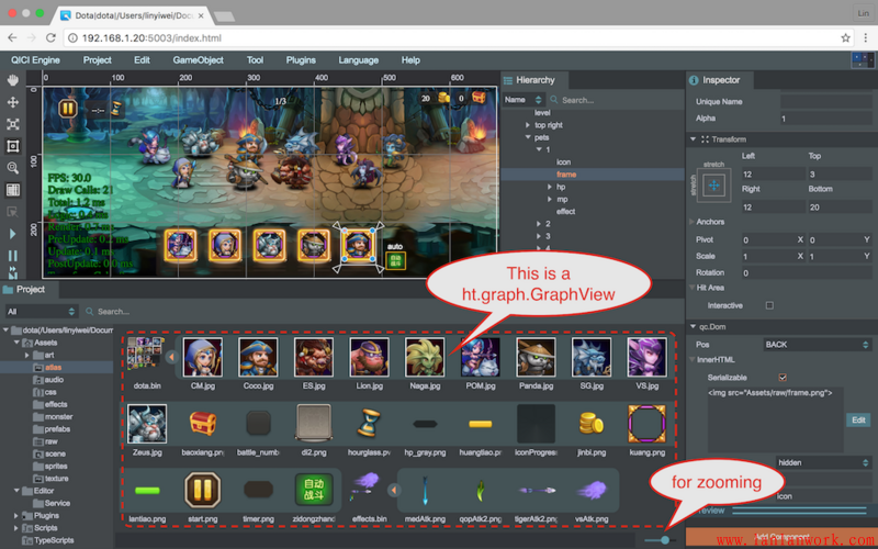 整個 QICI Engine 的 HTML5 游戲引擎編輯工具就是基于 HT 組件定制開發(fā)出來的,上圖刀塔場景的資源管理器就是圖標(biāo)可縮放,圖集可展開合并,可縮小變成樹層次的 GraphView 拓?fù)鋱D,而第二張的動作編輯器、曲線編輯器等等部分也都是 GraphView 的身影。