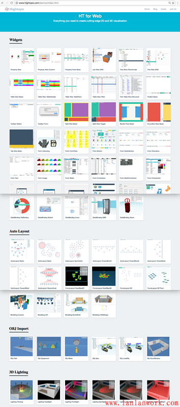 這樣綜合并可搜索的手冊入口居然還常被問及 HT 的 Demo 在哪里?只能怪這些年深入人心的用戶體驗理念,把人慣得包括很多程序員都如此之“懶”,當(dāng)然也怪我們沒把用戶體驗的最后一公里做到位,于是最近 wangyinlong 同學(xué)人工例子抓圖,將數(shù)百個手冊例子進(jìn)行了歸類整理,最終形成了方便大家直觀查找所有 HT 例子的頁面:http://www.hightopo.com/demos...