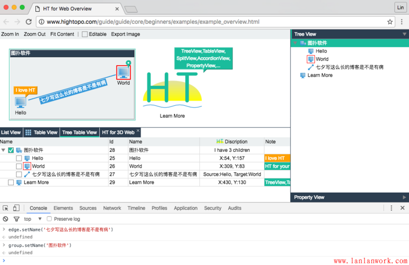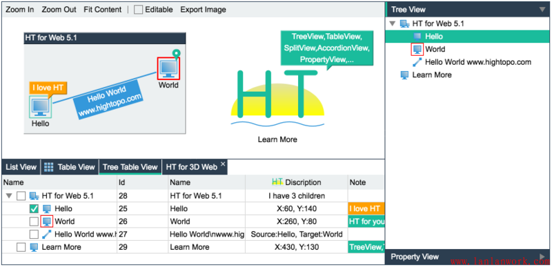 這個例子增加了設(shè)置父子關(guān)系的代碼,同時有更多的組件(拓?fù)鋱D、屬性頁、列表、樹、表格、樹表組件)綁定了同一個數(shù)據(jù)模型 DataModel,但用戶的代碼依然主要在 Data 和 DataModel 上的操作,這也是 HT 架構(gòu)設(shè)計的優(yōu)勢,用戶使用更多組件并沒有增加新的學(xué)習(xí)成本,只要掌握的 DataModel 的基本操作,更多的組件也是如此。