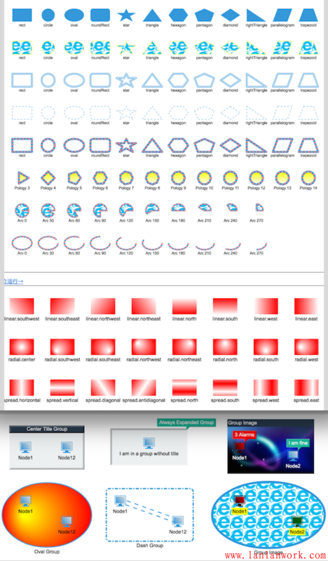 剛才的例子我們提到了一個 Group 類型,這個類型圖元節(jié)點在 GraphView 上顯示成了組合效果,可雙擊展開合并,可跟隨著孩子節(jié)點的位置大小變化和自適應(yīng)變動,除了 Node、Edge、Group 外,HT 還提供了 Shape、Polyline、Grid、SubGraph 等多種圖元類型,這些圖元類型都具是有針對性的展示效果,以滿足各種行業(yè)的基本圖元需求:http://www.hightopo.com/guide...