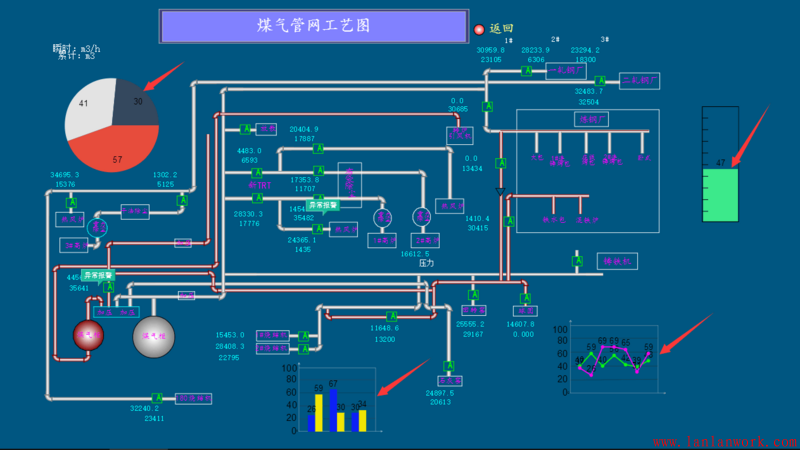 另外 HT 的矢量內(nèi)置了 Chart 類型,矢量內(nèi)置的 Chart 不同于傳統(tǒng)獨立的 Chart 組件,傳統(tǒng)的 Chart 是獨立的視圖 DOM 組件,但 HT 的拓?fù)涫?Cavans 方式繪制,因此沒法實現(xiàn) Chart 組件和普通圖元的不同層次融合顯示,但矢量的 Chart 類型倒是完美的實現(xiàn)了這樣的融合,很多工控應(yīng)用的客戶會將矢量 Chart 與拓?fù)鋱D元素融合一體,可參見《基于HT for Web的Web SCADA工控移動應(yīng)用》http://www.hightopo.com/blog/... 一文中 HT 的 Web SCADA 應(yīng)用案例
