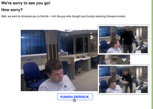 這方面最經(jīng)典的案例莫過于Groupon的著名段子,"懲罰Derrick"。雖然這個過場發(fā)生在用戶確認(rèn)退訂之后,但它通過真實(shí)的人物以及鋒利而又自嘲的幽默,切實(shí)拉近了用戶與網(wǎng)站之間的距離。在這個多多少少會使退訂用戶產(chǎn)生內(nèi)疚的段子之后,Groupon還會再慫恿用戶重新進(jìn)行訂閱。雖然你清楚的知道這是他們玩的小伎倆,但在如此具有代入感的段子面前,多數(shù)用戶會覺得非常有趣,正面情緒和狀態(tài)完全被調(diào)動起來。