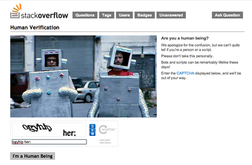 驗(yàn)證工具Captcha在如今被很多網(wǎng)站所使用,但這不意味著用戶真的喜歡這東西,很多時(shí)候Captcha確實(shí)會令人感到煩惱和挫敗。我們暫時(shí)無法改變這個工具本身的工作機(jī)制,但至少可以像Stack Overflow那樣通過一幅有趣的圖片搭配說明文案,向用戶解釋為什么要使用這個煩人的工具,籍此獲得用戶的理解,減少負(fù)面情緒的產(chǎn)生。