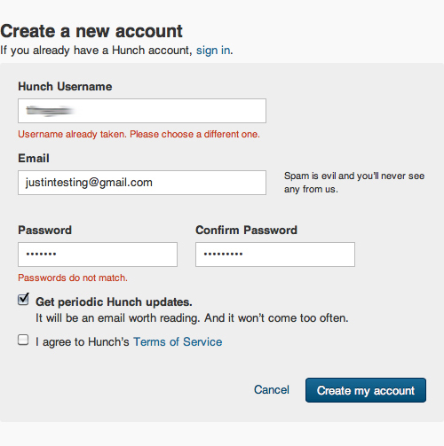 Hunch 注冊頁面當(dāng)中的文案與我們通常能夠見到的那種有所不同,他們會在輸入郵件的文本框旁邊告訴你“垃圾郵件是魔鬼,我們可不干這事”,還會在選擇郵件訂閱的地方提示你“這會是值得一讀的郵件,而且來的不會太頻繁”。在這些很普通的地方稍稍花些心思,制造一些細(xì)微的差異化,這會增強(qiáng)產(chǎn)品的代入感,使用戶的注意力更集中,跟隨設(shè)計(jì)的指引完成操作目標(biāo)。