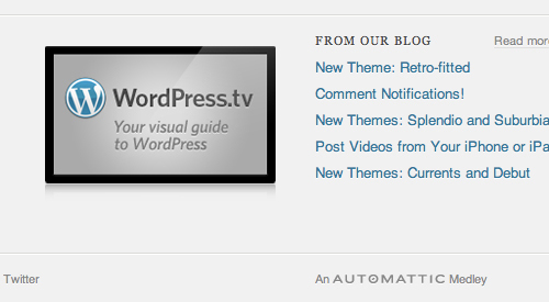 文案 :在wordpress.com首頁的頁腳當(dāng)中有一段每次加載頁面都會發(fā)生變化的簽名語,有時(shí)是“來自Automattic的產(chǎn)品”,有時(shí)變?yōu)?ldquo;來自Automattic的樂章”。這種細(xì)節(jié)體現(xiàn)了他們對于自己產(chǎn)品的熱愛。