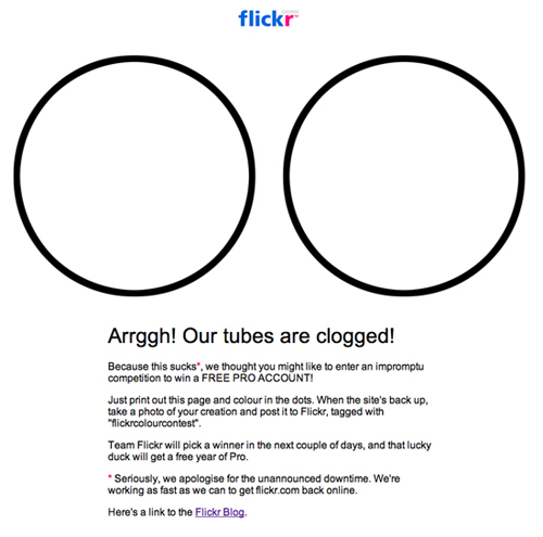 同樣來自于Flickr的案例。當(dāng)系統(tǒng)發(fā)生了一些更加嚴(yán)重的問題時(shí),他們會告訴用戶:“額,我們的管道堵塞了!”,然后使用非??谡Z化的文案表示了歉意。除此之外,他們還為用戶設(shè)置了一個小任務(wù),也就是將當(dāng)前頁面打印出來,為兩個圓環(huán)填色,然后拍下來,等到站點(diǎn)恢復(fù)正常后傳到Flickr上;Flickr團(tuán)隊(duì)會挑選出優(yōu)勝者,向他們贈送一年的高級帳號。