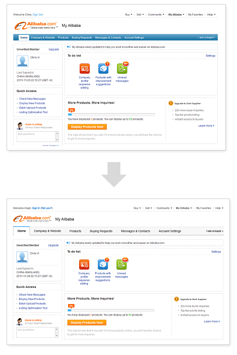 上圖我們團(tuán)隊(duì)對(duì)alibaba.com提供的服務(wù)介紹頁(yè)面進(jìn)行改版的項(xiàng)目,改版前的設(shè)計(jì)層級(jí)區(qū)分不明顯,使得用戶進(jìn)入該頁(yè)面時(shí)不能快速了解服務(wù)的概況,來(lái)判斷是否繼續(xù)深入了解;而改版后通過(guò)大小的對(duì)比,呈現(xiàn)抓住用戶第一眼印象的信息,初步判斷符合自己的需求,用戶才會(huì)繼續(xù)瀏覽。